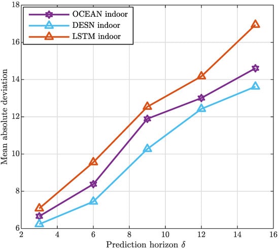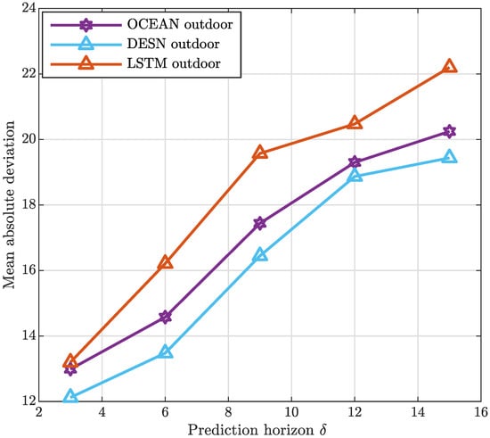 Aiming at analyzing the performance of the strategies taken into account, the MAD has been represented in Figure 5 and Figure 6 considering, also in this case, both the indoor and outdoor application contexts.As it is clearly evident from both the Figures, the prediction accuracy is greater when the proposed algorithms are applied. In addition, it is important to highlight that one slot is assumed equal to 4 ms. Furthermore, in all the strategies the MAD grows by increasing hereafter expressed in milliseconds, and denoting the time horizon considered to perform the prediction. It is a direct consequence of the complexity in predicting system dynamics over long interval times. To extensively analyze the framework designed, Figure 7 and Figure 8 depict the MAPE metric trend, for the indoor and outdoor cases, respectively. The results confirm the good performance of the proposed approach in comparison with the alternatives taken into account.