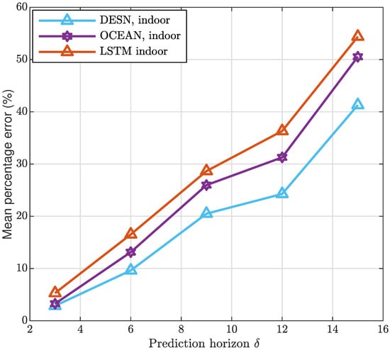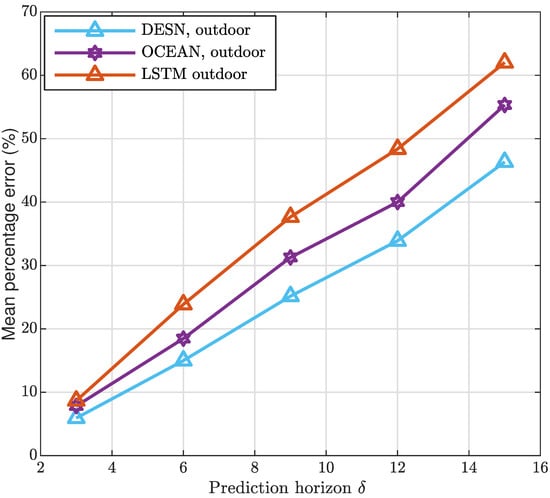 Furthermore, the validation of the proposed scheme has been provided considering both the indoor and outdoor conditions, and the forecasting performance has been depicted in terms of mean forecasting errors to express the prediction accuracy. Finally, the CSI prediction accuracy resulting from the application of the proposed framework has been compared with that obtained with the strategy proposed in [2] and [16]. As it is evident to note from the simulation results, the proposed strategy overcomes the performance reached by applying the methods presented in [2,16], and constitutes a suitable prediction approach for the 5G networks. Such remarkable performance is due to the introduction of a further deep learning phase given by the DESN in comparison to the alternatives taken into account. In fact, the DESN, belonging to the RNN class, is particularly suitable in catching the temporal patterns characterizing data, resulting in a better fit of the data behavior.