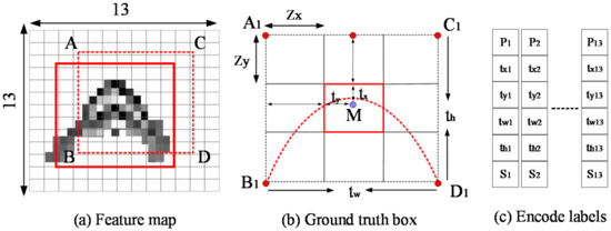 Soil objects underground are regularly sensitive to electromagnetic waves caused by its physical properties [22,23]. Most of them appear as parabolic with openings downward or obvious energy reflection in electromagnetic waves format. GPR moves along the survey line and continuously collects a series of trajectories (A-scan) to form electromagnetic wave B-scan images [24]. Before YOLO v3 training, GPR images were collected in this way. As mentioned in Section 2.1, YOLO v3 outputs feature maps or cells by three different stages, and each bounding box is responsible for multiple categories [25]. Suppose that the input GPR images size still is 416 × 416, as shown in Figure 3a, then the original picture can be divided into 13 × 13 cells. Those cells that are parabolic vertex M in the GPR images are responsible for predicting corresponding targets. When annotating GPR image samples, we make the center of ground truth box (rectangle A1B1C1D1) to correspond to the position of parabola apex. Red box in Figure 3a contains the midpoint of target wave; rectangle A1B1C1D1 marked as red solid line is ground truth bounding box and ABCD marked as red dotted line represents the predicted box. Figure 3b shows the encode ways of ground truth box in YOLO v3. Point A1 is the top left corner of box; tx and ty are the pixel position of point A1 in GPR image. Zx and Zy are noted as pixel width and height of each cell respectively. The width of B1D1 is marked as tw and the height of C1D1 is marked as th. As shown in Figure 3c, each bounding box was attributed to one object score or confidence, 4 box coordinates (tx, ty, tw, th), and one class score Si. Here, Si follows similarly as the one hot encoding method and. If Si equals to 0, there was no current detected target in the GPR image; otherwise, if Si equals to 1, it indicates that there exists current detected target. Finally, the feature map corresponds to 13 × 13 cells, and the output bounding box encoded tensor shape is (13 × 13, 6). If there were n GPR image samples, then all bounding box sizes corresponded to tensor (n, 13 × 13, 6). It is worth noting that if it is a non-hyperbolic target, such as the voids detected below, we will use the original encoding method of YOLO v3.