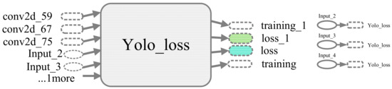 where in the Equation (9) is denoted as predicted value, is expressed as the training tag value. Figure 6 below shows a graph of the YOLO loss function node in TensorBoard; the input element were the loss output of conv2d_59, conv2d_67, and conv2d_75; where the input_1, input_2, and input_3 correspond to the gprErr, viouErr, and clsErr in Equation (6) respectively.