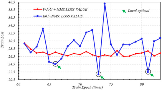 After derivation of Section 2.5, IoU-YOLO v3 loss function contains three parts. The first part is the average error loss of the centroid position in GPR bounding boxes which is centroid position (,) relative to ground truth boxes. Here, the coordinate related to x axis of the predicted bounding box can be denoted as which is equal to and its coordinates related to y axis can be denoted as . Obviously after weight processing, the smaller the loss value, the closer the centroid between the predicted coordinate and the true value, the better the prediction performance of logical regression function. In the first training phase of YOLO V3 with the V-IoU and NMS, when the epoch was less than 10, the loss value began to decrease very fast. When in the second stage, the convergence speed of loss function became steady and slow. Comparing the blue curve without adding V-IoU in Figure 9, the training performance of YOLO loss function seemed equivalent in two stages, but the completion time of entire 83 epochs was 3 h and 57 min. This is because the local optimization produced by the training process will affect the algorithm calculation efficiency to update function weights by back propagation. For this reason, as can be seen from Figure 10, the loss value of IoU + NMS had been changing back and forward between 22.5 and 40, and three local optimal solutions that appear at the positions are indicated by five green arrows; however, V-IoU + NMS was relatively stable, and it is undemanding to perform global gradient descent to find the global optimal solution. In order to prevent data over fitting, the loss function is considered to be sufficiently convergent; when the epoch was equal to 83 iteration was stopped.
