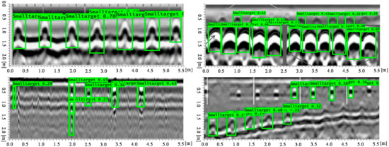 When there were multi-class targets in the detected GPR image, the predicted boxes can distinguish or identify the parabolas or voids. For some parabolas with multiple overlapping signals the vertex of curve was well positioned, as shown in Figure 12. Obviously, the less electromagnetic interference or noise in the GPR image, the better recognition and location performance. Those targets that are shallow from the soil surface had relatively obvious higher recognition scores. It can be seen that there were no misidentified boxes, all targets can be identified and located to the parabolic midpoint at overlapping positions. Figure 12 showed that the parabola with signal oscillation due to some highly conductive targets can be identified and located by the YOLO v3 detector with V-IoU. Overall, in this multi-class targets situation, total 82 hyperbolas in GPR image were tested. The correct detection number is 62, missed targets number is 4, and false alarm number is 5.