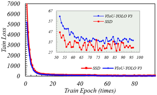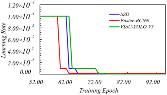 The learning rate directly affects the convergence state of the YOLO v3 training performance, and batch size affects the generalization performance. Earlier, we have discussed the Adam adaptive algorithm to update the global learning rate. In TensorFlow, we set the initial parameters of the learning rate to the same value. Here we evaluate the model optimization of SSD, faster-rcnn, and VIoU-YOLO v3 through the change of learning rate in training epoch. As shown in Figure 14, the learning rates of SSD, faster-rcnn, and VIoU-YOLO v3 were between 52 and 72 in epoch. The YOLO v3 has converged to a stable value when epoch was 73, which made the updated weight of loss value in TensorFlow to be reduced to the global threshold in a shorter time. The change of SSD is very close to VIoU-YOLO v3, but we can see from Figure 15 that the same situation occurs again similarly to Figure 9. Loss value of the SSD model will easily converge to its local optimal value with the increase of training times; obviously, after comparing the learning rate and loss value, the convergent speed of YOLO v3 with VIoU is more ideal.