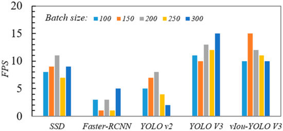 In expectation of testing the real-time detection speed of YOLO v3, we randomly selected five batches from 331 GPR images with size 416 × 416; the number of image batches were 100, 150, 200, 250, and 300, respectively, and took the mAP value in Table 1 as reference. Computer processor still is Intel(R) Gold 6130 with CPU with 2.10 GHz. As shown in Figure 16, when the batch size was 200, the detection speed of SSD can reach to 11 fps. After comparison, the detection speed of Faster-RCNN in each batch was not ideal, and its maximum detection speed is just 5fps. It can be seen from Figure 16 that the average detection speed of YOLO v2 is 5 fps. The fastest detection speed of YOLO v3 and VIoU-OLO v3 can reach 15fps, and their average value is around 12fps. In other words, when the vehicle is equipped with GPR device, its detection speed can reach between 10 km/h and 20 km/h. Consequently, the VIoU-YOLO v3 detection method proposed in this paper can fulfill the real-time detection requirements.