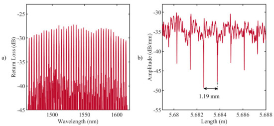 (a) Reflection spectrum of the fabricated fiber Bragg grating (FBG) array with the femtosecond point-by-point writing technology: 40 gratings, equidistant in 1464.5–1614.5 nm wavelength range; (b) LUNA OBR 4600 backscattering signal: the distance between the ends of the gratings (drops in amplitude) is 1.19 mm.