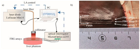 Experiments were performed on ex vivo porcine liver. The liver was obtained from a local butcher the same day of the experiment and stored at 4 °C until the experiment was carried out. Three highly dense FBG arrays, (FBG arrays 1, 2, and 3) were placed on the liver surface by means of a custom-made box. The plexiglass box was used to control the relative position between each fiber, equal to 2 mm (Figure 2b). The laser spot was focused on the center of the arrays, and Micron Optics si255 interrogation unit was used to measure the reflected Bragg wavelength spectra of the array, with a sampling frequency of 100 Hz.