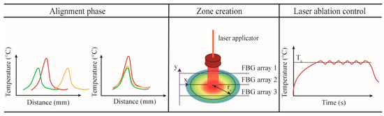 The developed real-time closed-loop temperature control algorithm utilizes an ON–OFF logic based on spatial temperature information, and performs a strategy that the authors call zone-control logic. The implemented zone-control logic consists of three main sub-parts: (i) alignment, (ii) creation of the spatial temperature maps and definition of the radius, and (iii) laser ablation control (Figure 3).