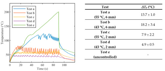 Figure 4 reports tissue temperatures during LA measured in correspondence to the grating of FBG array 2 experiencing the highest temperature. The profiles obtained in the controlled cases (Figure 4, blue, red, yellow, and purple lines) are distinguishable from the uncontrolled experiment. (Figure 4, green line). In particular, the experiments performed with the temperature-feedback control show that the maximum temperatures follow the set thresholds; moreover, a characteristic sawtooth-like shape is observed, due to the effect of the laser that is switched ON and OFF according to the set Ts and rs. In each experiment, these maximum temperatures oscillate around the correspondent Ts, and the magnitude of these oscillations depends on rs. The table enclosed in Figure 4 lists the values of these oscillations, ΔTp, which are calculated by the difference between the temperature at the highest peak and the subsequent valley.