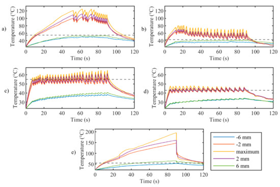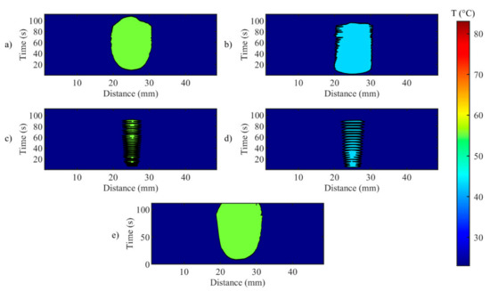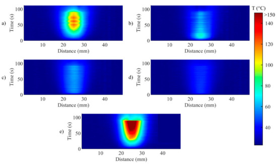 Two-dimensional thermal maps (distance along the sensor vs. time) during (a) Test a, 55 °C and 6 mm; (b) Test b, 43 °C and 6 mm; (c) Test c, 55 °C and 2 mm; (d) Test d, 43 °C and 2 mm; (e) uncontrolled ablation.