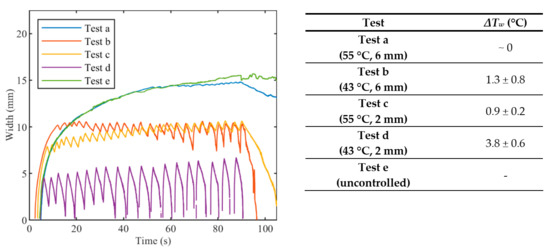 The widths of the contours at 43 °C are presented in Figure 8. Both Ts and rs affect the width of the hyperthermia zone and the fluctuations of the width. Indeed, the width at 43 °C observed in Test a (Ts = 55 °C, rs = 6 mm) is close to the width at 43 °C observed in Test e (uncontrolled ablation), and both reach a value of about 15 mm at the end of the thermal procedure. Due to the effect of the heat conduction, after that the laser is switched OFF, the Test a and uncontrolled case show different behavior: the width at 43 °C for the uncontrolled case remains almost constant whereat it starts to drop off immediately for Test a. The widths at 43 °C achieved with Test c (Ts = 55 °C, rs = 2 mm) and Test b (Ts = 43 °C, rs = 6 mm) presents similar trends, with a maximum value of about 10 mm at the end of the ablation. For the Test d (Ts = 43 °C, rs = 2 mm), fluctuation of the width at 43 °C reaches approximately 7 mm, corresponding also to the maximum value at the end of the procedure. The Table enclosed in Figure 8 lists the values of the oscillations of the width (ΔTw), which are calculated by the difference between the temperature at the highest peak and the temperature at the subsequent lowest peak.