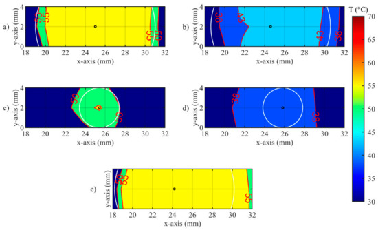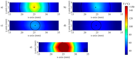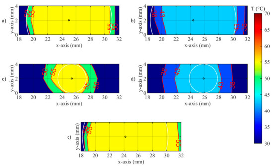 Isotherms of spatial distribution measured on the tissue when laser changes its state from OFF to ON, for (a) Test a, 55 °C and 6 mm; (b) Test b, 43 °C and 6 mm; (c) Test c, 55 °C and 2 mm; (d) Test d, 43 °C and 2 mm; (e) uncontrolled ablation.