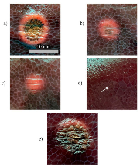 Thermal damages obtained in the hepatic tissue with controlled and uncontrolled ablations are presented in Figure 10. The RGB images show that the damage is visible for Ts = 55 °C, regardless of the value of rs (Figure 10a,c), and that the damaged area increases with rs. In the experiments carried out at Ts = 43 °C, the thermal damage is distinguishable only for rs = 6 mm (Figure 10b), whereas a minor effect of tissue dehydration is slightly noticeable for rs = 2 mm (Figure 10d, white arrow). As expected, the high temperature (up to 200 °C) experienced by the tissue during uncontrolled ablation (Figure 10e) caused the largest damaged area as well as the more severe damage. It is worth highlighting that the uncontrolled ablation margins of the lesion are more irregular than the margins obtained with the zone-control logic.