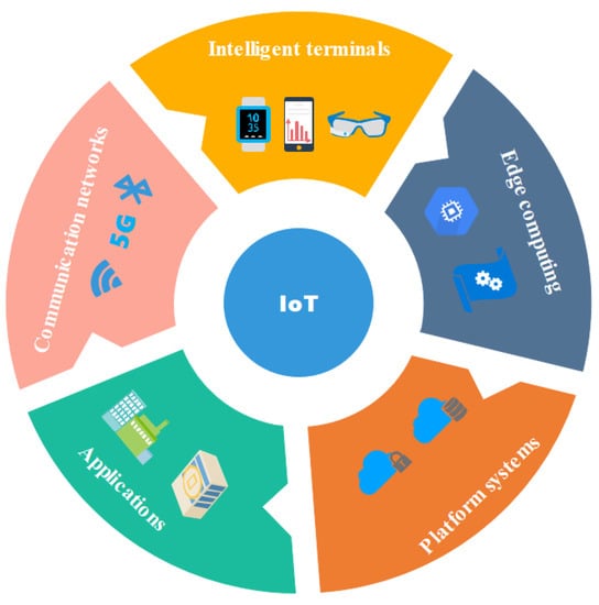 The Internet of Things (IoT) is an environment in which physical things are embedded with electronics, software, sensors, and network connectivity, with the ability to transfer data and generate collaborative outcomes []. The IoT has gradually developed into a mature ecosystem composed of intelligent terminals, communication networks, edge computing, platform systems, and IoT applications, as shown in Figure 1 [,].