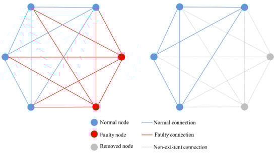 When faulty nodes are detected by discrete heartbeat signals and removed, the number of effective nodes becomes , as shown in Equation (4).