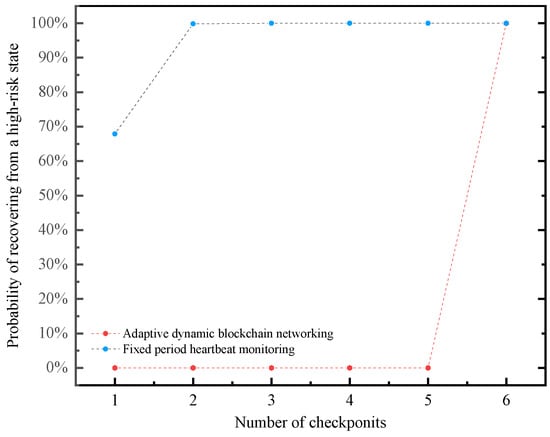 It can be seen from the data analysis that the system has a 67.9% probability of recovering from a high-risk state at , while the probability is more than 99.9% at . The response time of adaptive dynamic blockchain networking is better than that of fixed-period heartbeat monitoring.