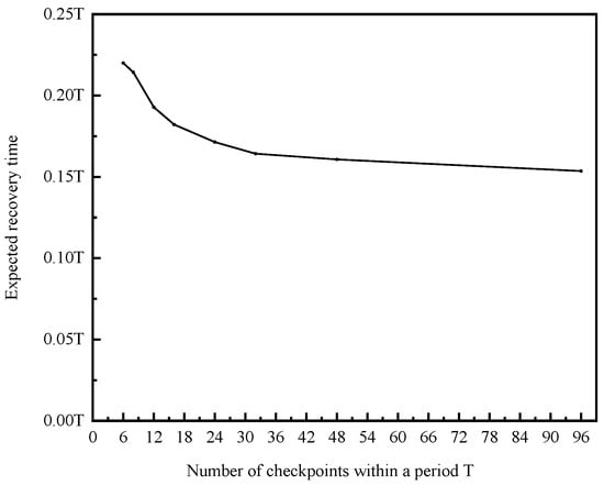 The shorter expected recovery time indicates that the system can recover from a high-risk state in a shorter time when node fluctuations occur, which is an important indicator of system stability and security. We try to adjust some parameters in the adaptive dynamic networking to optimize the expected recovery time. Adjusting the number of checkpoints within a period is an effective method, as shown in Figure 5.