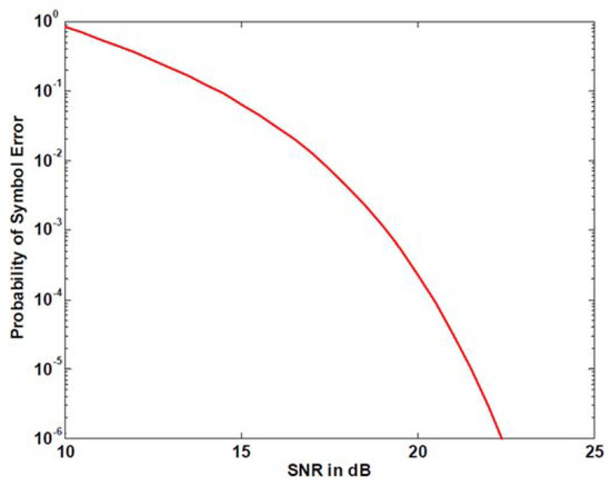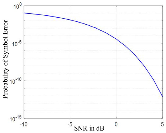 Figure 6 shows the error probability of 3S-PPM given in [26], and the difference between the analytical and simulation results is mostly due to the use of an ideal band-pass filter for the analytical model and a second-order Butterworth filter for the simulation. As shown in Figure 6, the red line represents the simulation model and the blue line the analytical model.