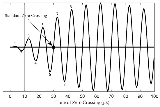 The standard zero crossing (SZC) is the positive zero crossing at the point 30 microseconds into a positively phase coded pulse on the antenna-current waveform, as shown in Figure 12. Given in [7], this zero crossing is phase-locked to the eLORAN station’s cesium time reference. The standard zero crossing is used as a timing reference for measurement of eLORAN signal specifications.