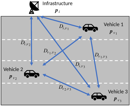 The ground truth position of vehicle , where , is represented in two-dimensional coordinates denoted by . The measurements of are subject to additive measurement noises of self-localization with the same dimensions denoted by . Vehicle thus obtains an erroneous measurement . Upon the measurement, vehicle transmits a message pertaining to to its neighbors via mmWave communication. By the transmission of mmWave, the inter-vehicular distance and AoA with respect to each neighboring vehicle is measured [22,23]. In particular, the distance from vehicle to vehicle is defined as . In a similar manner to observing instead of , additive noise occur. The resulting erroneous measurement is therefore .