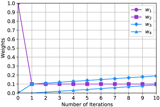 To observe particular values of weights , , , and upon the iteration, further algebraic manipulations obtain closed-form expressions of the weights at time t, as