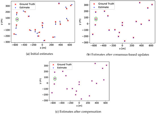 Figure 3 illustrates changes of the location estimates during the overall execution of the proposed strategy. Unlike the practical implementation discussed in Section 3.3, the compensation step is illustrated separately in order to clarify its role. The effect of adopting the practical implementation is subsequently discussed. The comparison is made between the ground truth locations and the estimates at three different stages—the initial estimation, the halt of the consensus-based updates, and the compensation. Each pair of the real and the estimated locations is connected by a line for the unambiguity. The estimate and the ground truth location of the anchor are indicated by a surrounding circle. Figure 3a shows the initial stage of the strategy, where no update has been applied on the estimates. Self-localization errors misplace the estimates randomly with respect to each corresponding ground truth locations. Since the self-localization of the anchor is noiseless in this particular case, the estimate made by the anchor is correctly placed onto the ground truth location. On the other hand, the immediate purpose of the iteration of the update is the delivery of the messages to as many neighbors as possible, rather than the convergence to an accurate value. To meet this purpose, the exact value of the threshold is chosen so that enough number of multi-hop can occur for the farthest pair of neighbors in the network can exchange messages. For the proposed test case, the threshold of m suffices for the longest possible inter-vehicular length of 1500 m. Under such a halt condition, four updates are iterated before the halt. The result of the consensus-based updates are shown in Figure 3b. The updated estimates are all similarly misplaced slightly downwards and to the left with respect to each corresponding real location. This shows that the updated estimates of all vehicles carry similar magnitudes and orientations of the error. Figure 3c depicts the location estimates after the compensation is applied. As indicated by the estimates placed onto the ground truths, much accurate estimates are achieved after the compensation.