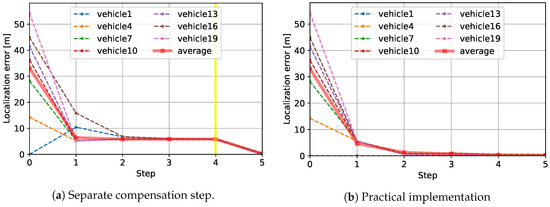 For the same test case, the reduction of the localization error at each step is shown in Figure 4 to compare both implementations of the compensation. Figure 4a shows the strategy where the consensus-based updates and the compensation are separately applied, while Figure 4b shows the strategy under the practical implementation. For clear representation, only a subset of 20 vehicles’ localization errors are presented; the vehicles are sorted by the amount of initial localization error and then every third vehicles are selected. Thus, the localization errors of 7 out of 20 vehicles are represented by the dashed lines. In addition, the average localization error of all 20 vehicles is shown together by the solid red lines. At the initial step, the amounts of the localization errors highly differ from each other. For instance, the anchor vehicle represented by the blue dashed line has no initial localization error while that of another vehicle is higher than 50 m. Such randomness rapidly diminishes in the following steps. First, in Figure 4a, as the consensus-based updates are executed from step 1 to step 4, the magnitudes of the vehicles’ localization errors are gradually homogenized. In particular, from step 2 to 4, little changes in the localization errors are observed as measurement noises are averaged out on the consensus basis. A yellow vertical line at step 4 indicates that the halt condition (11) for the consensus-based updates is met at the fourth update. At step 5, the compensation reduces the remaining localization errors effectively, leaving the estimates much more accurate than before. On the contrary, Figure 4b makes no distinction between the consensus-based updates and the compensation. While most features regarding the reduction of errors are retained, it is noted that the localization errors achieved in Figure 4a are also achieved in Figure 4b, indicating that the practical implementation of the compensation step does not degrade the localization performance. The performances in more diverse scenarios are discussed in the following section.