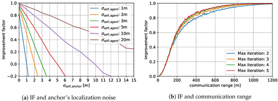 Figure 5a shows how IF changes with respect to the noise level of self-localization, denoted by . The change is observed under different settings of the agents’ self-localization noise levels, similarly denoted as . The increase of the self-localization error has a negative linear effect on IF since the trend of IF according to the noise level can be approximated to a straight line. For each line, the point where is reached when . For example, when of the agents equal 5 m, the corresponding red line crosses the point where when of the anchor equals 5 m. This suggests that the presence of an anchor that is superior to the agents in terms of the self-localization guarantees the improvement in the localization performance of all vehicles in the network. In other words, as long as the vehicle of the best localization accuracy can be properly determined, the proposed strategy enhances the localization accuracy of all vehicles. On the other hand, when of the agents are sufficiently low, IF does not reach 1 regardless of the precision of the self-localization of the anchor. This does not necessarily indicate that the estimates are less accurate when agent vehicles are capable of sufficiently precise localization; with lesser amount of noise is initially present, the proportion of the remaining noise is larger in such cases, thus preventing the IF from reaching 1.