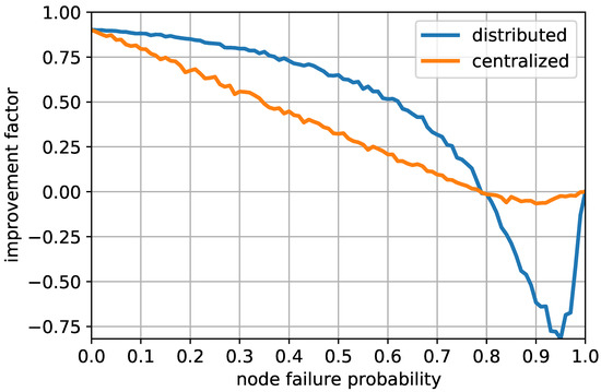 While Figure 5 shows the changes in the efficiency of the proposed strategy under various circumstances, Figure 6 shows whether the distributed implementation indeed grants more accuracy than simply employing a centralized management. For detailed comparison, situations where vehicles may be temporarily unavailable due to communication error are simulated. For the distributed protocol, when the anchor fails to communicate with others, an alternative vehicle temporarily acts as an anchor. The substitute for the anchor is chosen by , the noise level of the sensory devices that pertain to the self-localization. To represent accuracy differences among the vehicles, 20 different choices of are set to 1 m, 2 m..., 20 m. In such configurations, when the vehicle with m fails to communicate, another available vehicle with the lowest temporarily acts as an anchor. On the other hand, for the centralized implementation, only the central manager can serve as an anchor. When the central manager fails to communicate, all vehicles in the network are thus unable to perform the update, leaving with the unchanged initial estimates. The IF of both the distributed and the centralized approaches are presented according to the node failure probability ranging from 0 to 1. In both cases, zero node failure probability indicates that all vehicles stay available for the respective protocols. Since both implementations proceed in the same steps when no node failure occurs, both curves start at the same IF. As the node failure probability increases, the distributed protocol has a high IF over the centralized protocol. This suggests that as communication error occur more often, the distributed implementation successfully adapts to temporary setbacks while the centralized implementation cannot. However, When the node failure probability exceeds , both distributed and centralized implementations result in IF below 0, suggesting that the vehicles’ initial self-localization results are more accurate than the results that utilize poorly exchanged data. In addition, the distributed implementation shows far worse performance than the centralized implementation when the node failure probability is between and 1. This observation is made since, when most vehicles become unavailable during the exchange, the distributed protocol may send out the compensation based on the vehicle of very poor accuracy, thus degrading the quality of all estimates in the network. Finally, if the node failure probability equals 1, no exchange is carried out and both IFs equal 0 at this point. The comprehensive observation thus suggests that the distributed implementation outperforms the centralized one for reasonable range of the node failure probability and that utilization of the proposed strategy may be undesirable when the communication is severely impeded.
