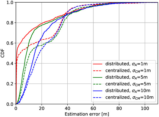 Figure 7 illustrates cumulative distribution functions (CDF) of the localization errors under different qualities of the anchor. The CDFs for multiple set of measurement noise levels are shown for both the distributed and the centralized modes. For the distributed mode, the measurement noise level of the anchor is denoted as , where that of the central manager is denoted as . For thorough observation, multiple probabilities of the communication failure were sampled from range of 0 to . Each pair of and of equal values are categorized by the same color of the graph. The figure shows that, for each pair of the measurement noise levels, the CDFs of the distributed protocol increase more rapidly than the those of the centralized protocol at lower estimation errors below 40 m. This indicates that the distributed mode exhibits more localization results with lower estimation errors. However, for estimation errors above 40 m, the CDFs of the distributed mode converge more slowly to 1 compared to those of the centralized mode. This indicates that low quality measurements of the anchor can be propagated throughout the network in the distributed mode, degrading the overall quality of the localization. While the distributive localization can provide high-accuracy estimation in most cases, the message exchanges are therefore inhibited when measurements of such low qualities are made in order to contain erroneous measurement.