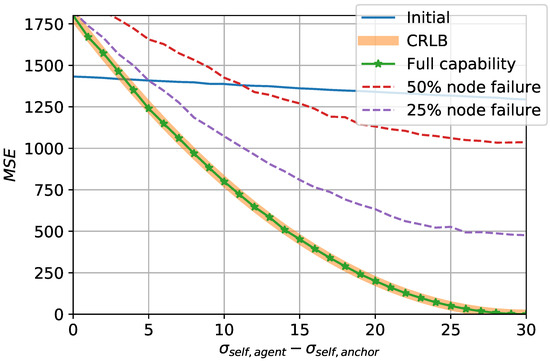 To observe whether the proposed strategy achieves the optimal performance, Figure 8 compares the CRLB obtained in (13) and the mean squared error (MSE) of the resulting location estimates under different circumstances. The horizontal axis of the figure indicates the difference between the noise levels of the self-localization of the anchor and the agents, respectively denoted by and . With fixed to 30 m, decreases from 30 m to 0 m along the axis. The figure shows that the MSE of the proposed strategy under no hindrance, labeled as ’full capability,’ coincides with the CRLB. This indicates that the proposed strategy successfully achieves the optimal performance of the estimator when no particular impediment exists. However, as examined from the previous observations, unfavorable settings may result with updates that are less accurate than the initial estimates. Specifically, when the difference is less than about 3 m, the minimum achievable MSE of the estimator given by the CRLB is higher than the MSE of the initial estimates. This again validates in a new perspective that in order to benefit from the proposed strategy, anchor’s superiority of preciseness over the agents is required.