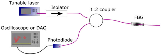 Following the FBG fabrication, the sensing optical fibers were transferred to an AE detection setup, which was based on the edge filter detection method [28]. It consisted of a tunable laser with a 100 kHz linewidth (Yenista TLS WDM), which was set to operate spectrally within the linear slope of the FBG. The light was distributed to the sensing element (FBG) and to the photodiode detector (PD) through a 1:2 optical fiber coupler (50:50 optical power splitting between ends). Between the coupler and the laser, a > 40 dB isolator was used to prevent light back-reflections reaching the source. The PD response to the acoustic waves was recorded using a Lecroy model HDO6104 oscilloscope. A schematic representation of the AE setup is illustrated in Figure 1.