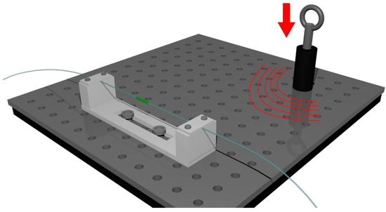 The optical fiber mounted on the U-shaped holder resembles the acoustic behavior of a rod attached to a spring-mass setup, an analogy that was used for modeling a similar system by Beadle et al. [36]. They showed that the longitudinal strain excreted in the optical fiber is inversely proportional to the optical fiber cross-section (see Equation (1) in Beadle et al. [36]):
