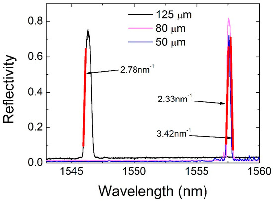 Calibrated reflection spectra of the FBGs inscribed in 125, 80 and 50 μm-diameter optical fibers.