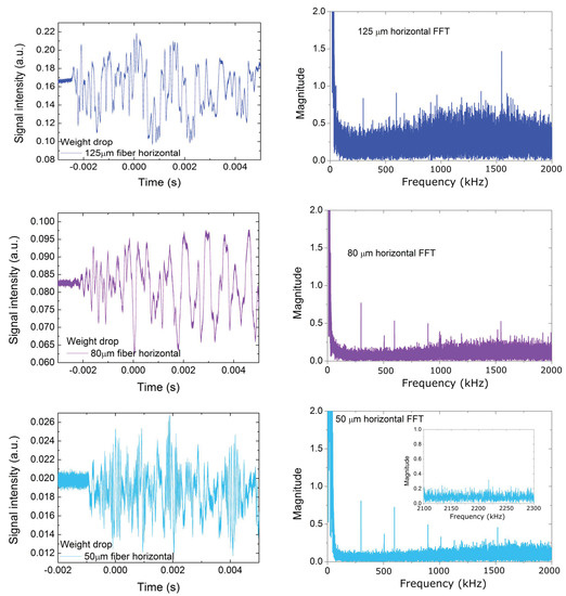 In the right column of Figure 4, a fast Fourier transformation of the acquired waveforms is presented, with emphasis on the ultrasonic frequencies. Both the FFT frequency plot range and magnitude are kept constant in all three graphs for the easier visualization of the differences. In addition, an inset for the 50 μm optical fiber is placed, showing signal detection at frequencies above 2 MHz, which was not detected by the larger-diameter optical fibers using our experimental setup.