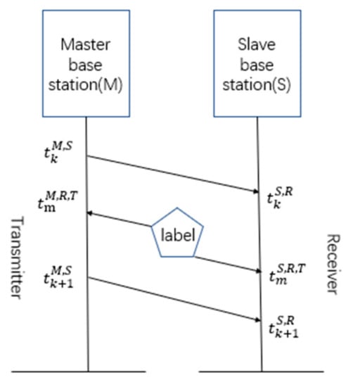 In summary, this paper tries to improve the time synchronization scheme with timestamp. The improved scheme is called clock synchronization based on synchronization packets. First, a master base station is selected from among the base stations participating in the positioning, and the other base stations are considered slave base stations [,]. Then the master base station periodically sends synchronization packets (including the exact synchronization packet transmission time) to the slave base stations to achieve clock synchronization between the base stations.