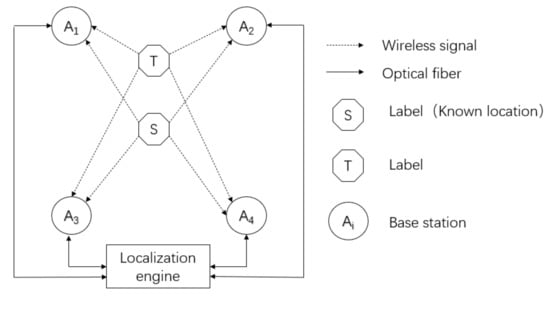 In the calibration method, first, a label (fixed and known coordinates) is required for error measurement. To better explain the error calibration method, a single positioning unit is extracted in the positioning system, as shown in Figure 3.