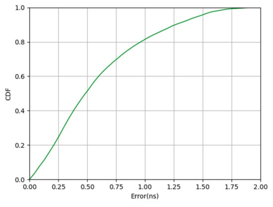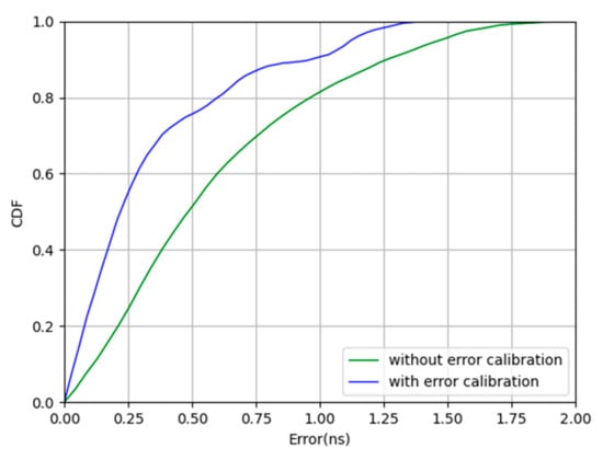 The experiment was based on clock synchronization, as shown in Figure 7; when CDF = 90%, the blue curve is about 0.97 ns, and the green curve is about 1.26 ns, which is an improvement by 23% when using the error calibration. The CDF curve proves the effectiveness of the error calibration.
