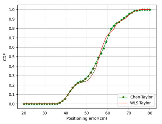 In experiments to verify the validity of the WLS-Taylor algorithm, neither the Chan–Taylor algorithm nor the WLS-Taylor algorithm compensated for TDOA values using error scales. The experiment used nine test points to evaluate algorithm performance, except for one error calibration point. The Cumulative Distribution Function (CDF) curves, which are able to completely describe the probability distribution of a real random variable for the positioning results, are shown in Figure 6.