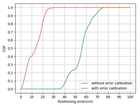 To confirm the effectiveness of the error calibration, the TDOA error with error calibration between one slave base station and the master base station was compared with that without error calibration, as shown in Figure 7.