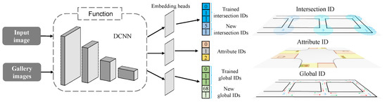 where represents the tuple of intersection ID, attribute ID and global ID of . In addition, represents the space of all valid intersection ID tuples. For a query image , it can also be mapped to an ID tuple by function f. Thus, the intersection re-ID task in a closed area can be formulated as searching the optimal mapping function f by minimizing the classification error with the assumption of groundtruth ID tuple as . For an open area, if the query image represents a new intersection, the function f should be able to recognize it and assign the image with a new ID tuple , interpreted as: