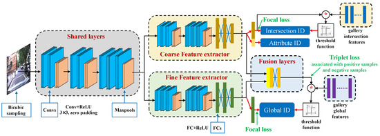 where , and respectively denote the Focal loss of coarse, fine, and global features. denotes the triplet loss of global features. The weights , , and for each loss are empirically set to 0.5, 0.5, 0.5, 1, respectively.