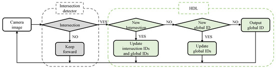 Updating strategy of intersection topological map. The system first perceives if the vehicle encounters an intersection. For a positive detection, the system checks if the image represents a new intersection or not. For a new intersection, the image will be assigned with new intersection and global ID. Both the image and its ID labels will be added into the database.