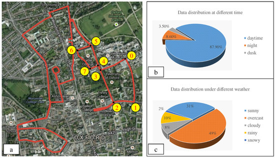 Our proposed RobotCar Intersection dataset is based on the prior work RobotCar [6], which is captured in the central area of Oxford by driving vehicle several times along a fixed route. In our dataset, to simulate the habits of human drivers, we choose images of the front-view camera (Bumblebee XB3, CCD, only Horizontal Field of View,) for intersection re-identification. Images of eight road intersections in a closed region (over 30,000 images with a resolution of ) are selected to build our dataset, as shown in Figure 5a. Inheriting the characteristics of the original RobotCar dataset, the selected images are with environment conditions of different seasons (from May 2014 to November 2015), time (day/night/dusk), weather (sunny/overcast/cloudy/rainy/snowy), etc. Detailed statistics about these images are shown in Figure 5b,c.