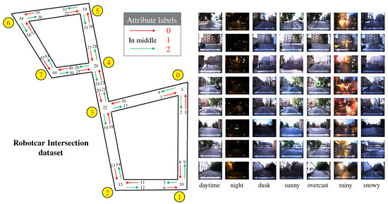 Furthermore, we assign each image with an additional global traversing pose ID for better recording the traversed route of the vehicle. Thus, each intersection image is labeled with three kinds of IDs. As shown in Figure 6, the intersection ID is only to identify the intersection location (0–7). The attribute ID of the intersection indicates the interactive relationship between the vehicle and the intersection: the label for entering the intersection is 0, the intersection crossing is labeled as 1, and the intersection exiting is denoted as 2. The global ID represents that the vehicle is at the designated location with designated driving direction. The extracted images are stored according to recording dates, and marked with the weather information. Corresponding labels are also stored in a similar way.