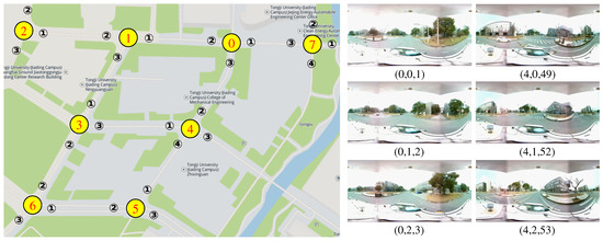 The panoramic image has a wide perception area in the surrounding environment, which can also be used for traffic intersection re-identification. In order to explore the performance of our proposed framework on different camera models, we provide the “Campus Intersection” dataset which consists of 3340 spherical panoramic images from eight intersections in the Jiading campus of Tongji University, as shown in Figure 7. The images are captured by a panoramic camera setup introduced in work [34] with a resolution of . The panoramic camera is formed by two fisheye cameras (S-YUE-U801, CMOS, Horizontal Field of View), which are installed back-to-back in this case.