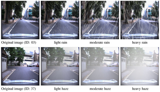 where is the observed hazy image value at pixel x. is the haze-free scene radiance to be recovered. is the brightness of the haze. A denotes the white atmospheric light. is the transmission matrix which is set with nonlinear proportion of pixel distance between each pixel and vanishing point. The density and brightness of haze is adjusted smoothly from 0.7 to 1.0, as shown in in the second row of Figure 8.
