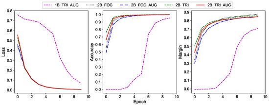 Loss, accuracy, and margin w.r.t. epoch number in training for different network structures and augmentation methods.