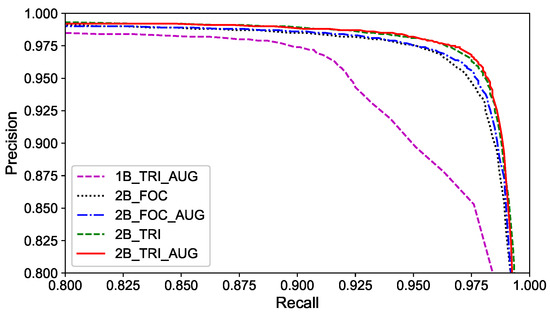 In experiments, the precision–recall (PR) curves of compared methods are depicted in Figure 10. From the curves, following points can be observed: (1) The method proposed in the paper can achieve high precision on intersection re-identification. (2) The performance of hybrid double-level network is better than that of the single-branch network, which is mainly because the HDL network can integrate coarse-grained features into the mainstream and provide semantic information of different scales. (3) The data augmentation also brings a minor performance gain, which demonstrates the positive effect by improving the diversity of training data.