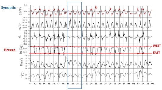 From top to bottom, the time series of, the turbulent heat flux w’T’ (m·s−1·K) (note that positive values indicate downward fluxes), the Monin–Obukov z/L, the wind direction (Dir), the wind speed (U), the air temperature (T). The units are indicated in the figure. The area in the blue box corresponds to synoptic flows; red lines delimit the cycle of the complete sea/land breeze in West-East directions.
