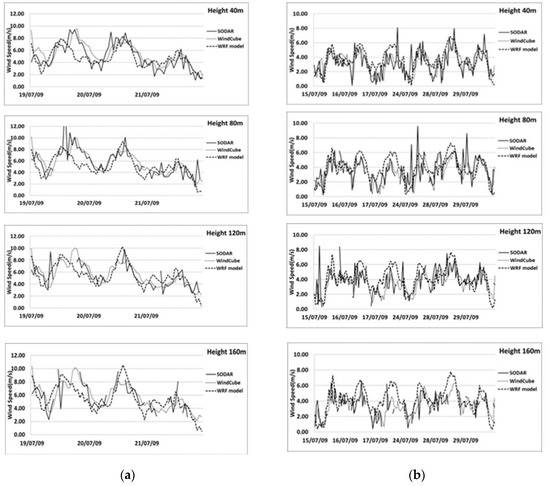 In this study, we analyze the temporal evolution and difference in wind profile among breeze regime and synoptic days. Figure 3 illustrates the comparison of the diurnal evolution of wind speed for different weather conditions, at different heights, using both remote sensing instruments and simulated data.